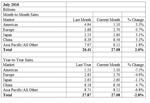 The Semiconductor Industry Association (SIA), has announced that worldwide sales of semiconductors reached $27.1 billion for the month of July 2016, an increase of 2.6 percent compared to the previous month's total of $26.4 billion. July marked the global market's largest month-to-month sales increase since September 2013, though sales were down 2.8 percent compared to the July 2015 total of $27.9 billion. Underscoring the welcome uptick, month-to-month sales increased in all regional markets for the first time since October 2015. All monthly sales numbers are compiled by the World Semiconductor Trade Statistics (WSTS) organization and represent a three-month moving average.